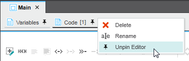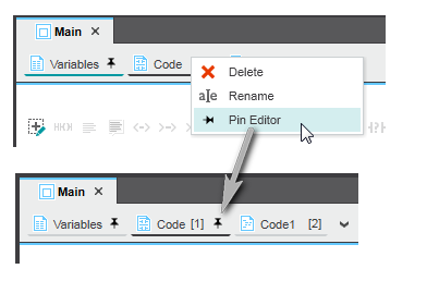 To pin an editor window, right-click the editor window tab and select 'Pin Editor' from the context menu. Pinned editors are marked with the pin icon on the tab. To unpin, select 'Unpin Editor' from the context menu. Both commands are also available as icons in the upper right corner of the editor window: