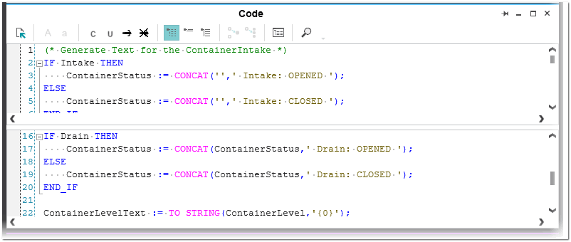 - Expanding and collapsing code blocks.The editor provides syntax-based folding by enabling you to collapse and expand particular or all code blocks. To collapse a specific code block, click the '-' icon in the text editor, to expand an element, click ('+'). To collapse or expand all code blocks in the ST code worksheet, click the corresponding toolbar button.