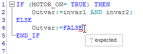 - Continuous automatic compiler checks in the background.While editing, the compiler continuously checks the syntax. Any detected errors are underlined red in the code/data type worksheet. When moving the mouse cursor on a red-underlined code, a tooltip shows information on the detected error (as shown in the following example). Additionally, errors are listed in the message window and indicated in the status bar.