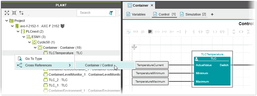 If the cross references are up-to-date (see the following note), you can directly jump to the call of a function block in the code worksheet from the instance tree under the 'PLCnext' node. The submenu of the 'Cross References' context menu command of an FB instance contains the code worksheet where the FB instance is used.