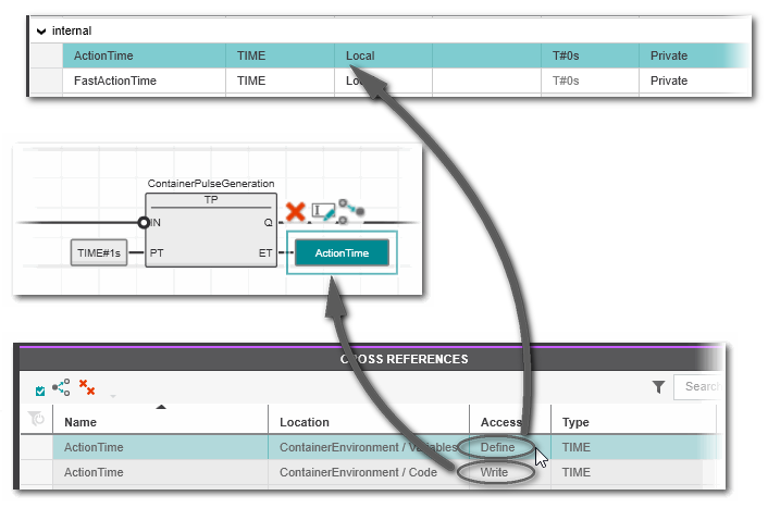 The CROSS REFERENCES window, located in the Cross Function Area at the lower screen border, lists all cross references in your project. For example, the use and declaration of all variable types (including user-defined STRUCTs), instance declaration and call of function blocks, jump labels, SFC elements (transition/action/step names) are listed, as well as HMI tags, and much more. Connectors are not listed.