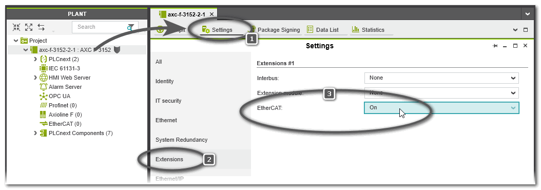 The EtherCAT functionality and therefore also the EtherCAT-related PLANT nodes and editors are only available if the controller supports this (PLCnext Technology controllers from firmware version 2026.0) and the functionality has been activated in PLCnext Engineer. To do this, proceed as follows: