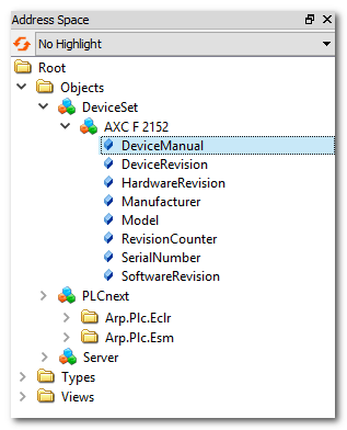 - 'none': clients cannot subscribe any port or variable via the OPC UA server. The entire 'PLCnext' node is excluded from the data information model.The Device Information (DI, according to the OPC UA standard) remains visible for clients. This includes controller information such as hardware and software revision numbers, serial number, manufacturer name, model specification, etc.