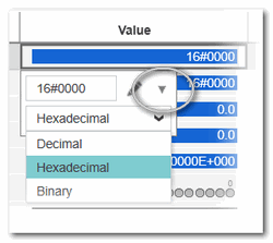 Some data types provide different possibilities of displaying their online values. To adapt the display, double-click the value of the variable. (Alternatively, right-click the variable and select 'Overwrite / Force' from the context menu or left-click the table line and press the shortcut <Ctrl> + <Alt> + <2>.) In the appearing Overwrite/Force control, click the drop-down arrow on the right and select the desired display format.