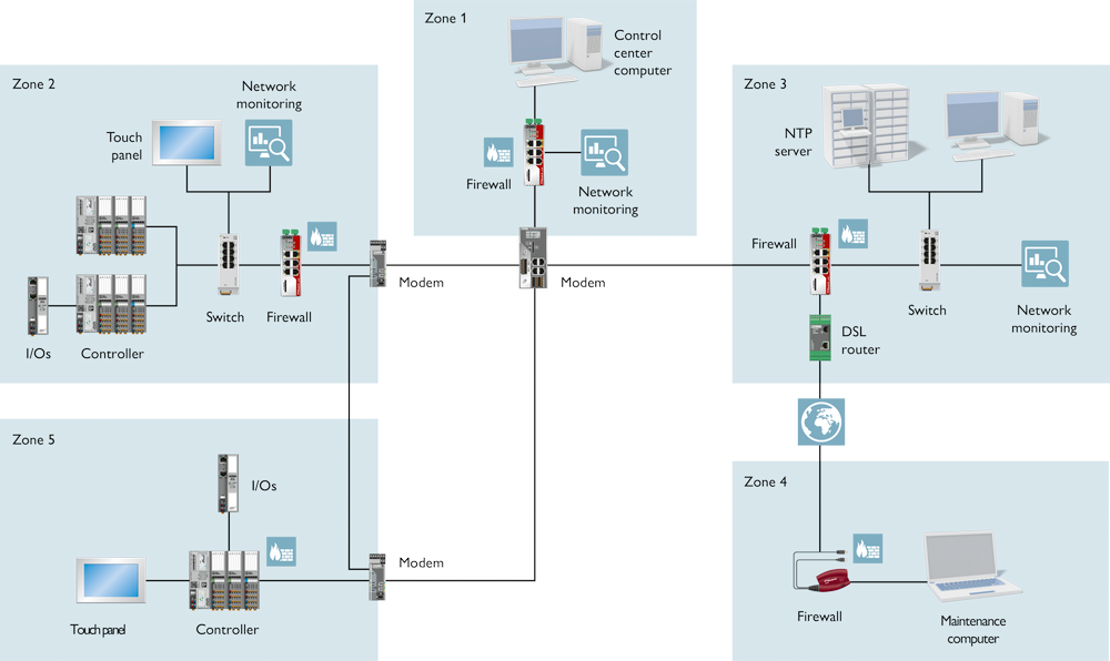 - Zone 5: Remote maintenance zone.We will look at zone 2 as an example in this context. Its function is to collect and process data from the process and the sub-process. It consists of a network monitoring (no. 1 in the figure), PLCnext Technology controllers each with I/O devices connected to the field bus (2), a WebPanel for controlling and visualization purposes (3), and an Ethernet switch (4). A firewall (5) handles the communication with the other zones (conduits).