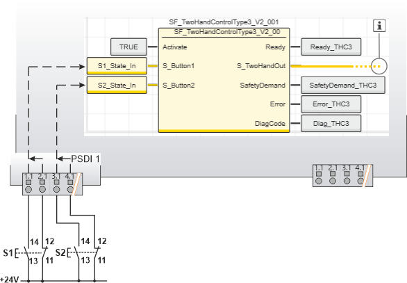 This example shows the connection of a type 3 two-hand control device with the safety-related SF_TwoHandControlType3 function block.