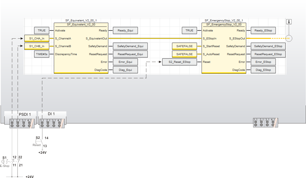 The emergency-stop control device is connected to the inputs 1.1 and 2.1 of the safety-related input device PSDI with an ID of 1 in accordance with the closed-circuit current principle (two N/C contacts). The two N/C contacts are fed to the S_ChannelA and S_ChannelB inputs of the safety-related SF_Equivalent function block for evaluation purposes.
