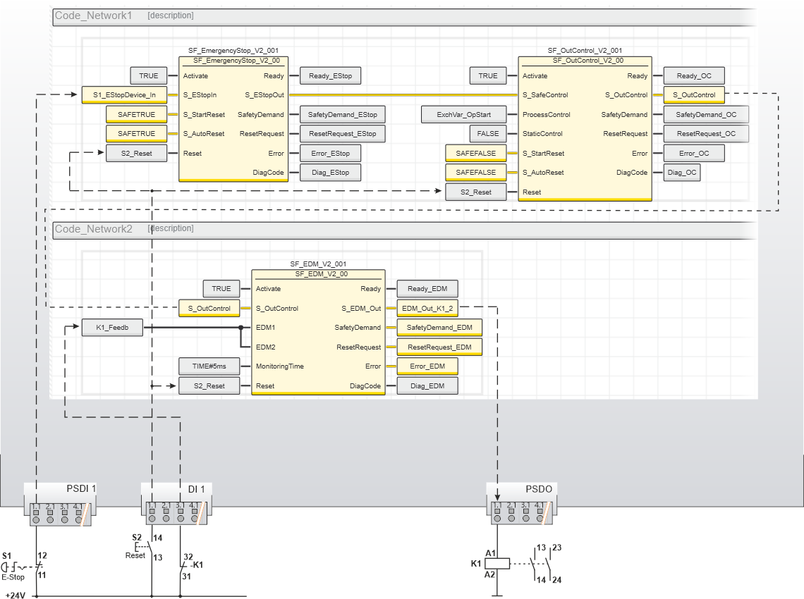 - The global I/O variable EDM_Out_K1_2 is connected to the S_EDM_Out output, which in turn is assigned to the output terminal 1.1 of the safety-related output device PSDO. Contactor K1 is connected to this terminal.