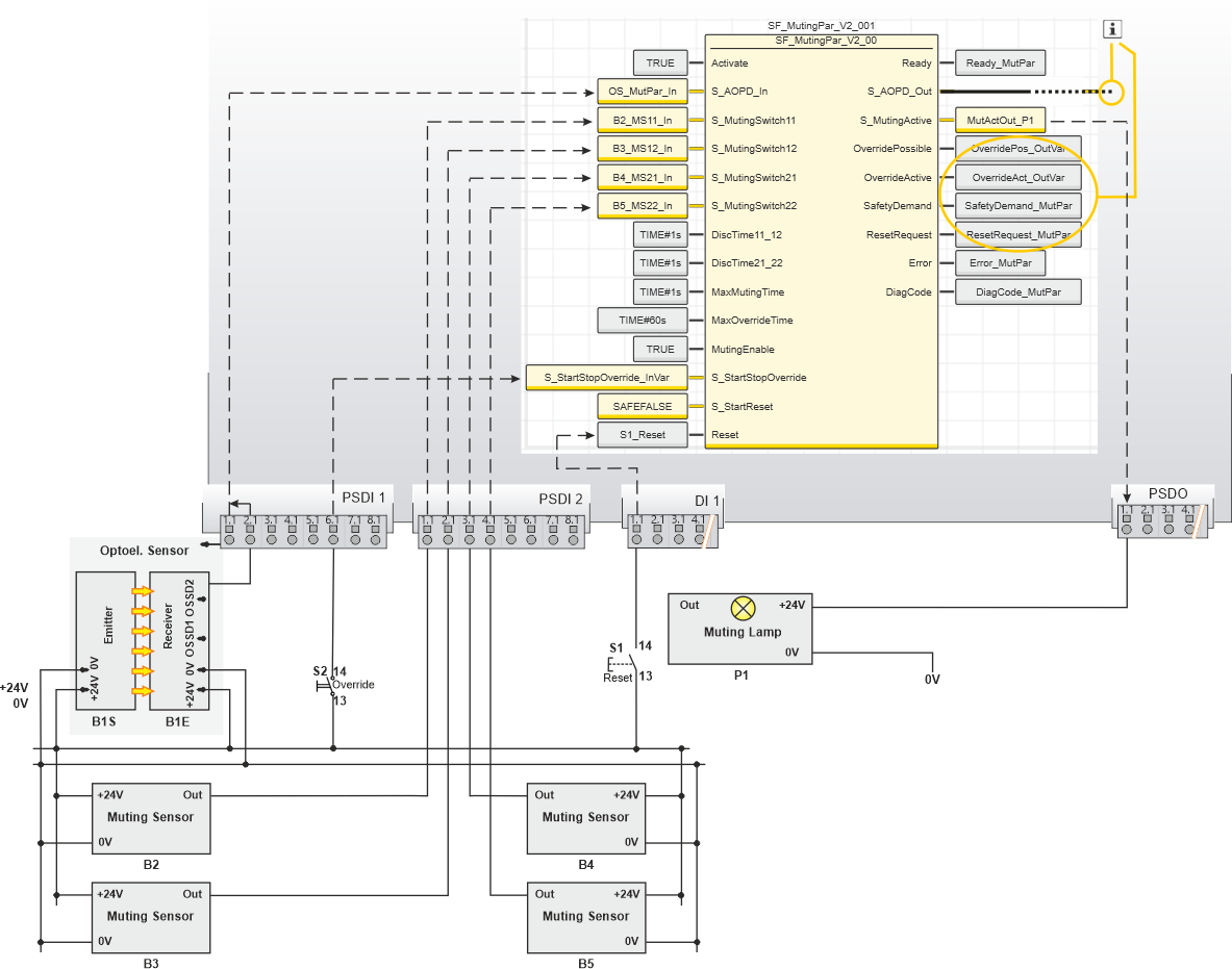 - The S_MutingActive output of the function block controls muting lamp P1 in order to signal the state "muting active". This muting lamp is connected to output terminal 1.1 of the safety-related output device PSDO. The assigned global I/O variable MutActOut_P1 is connected to the S_MutingActive function block input.