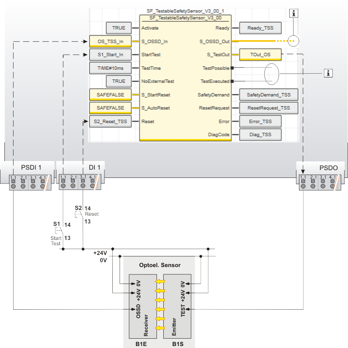 - The status signal of the sensor is connected to input terminal 1.1 of the safety-related input device PSDI 1 and assigned to the global I/O variable OS_TSS_In, which is connected in turn to the function block input S_OSSD_In.