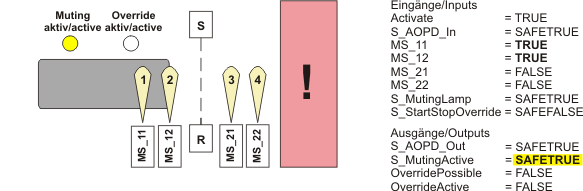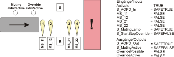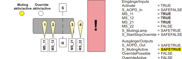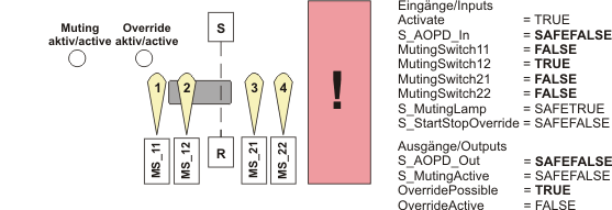 If the muting is interrupted by an error (e.g., the maximum muting time MaxMutingTime has elapsed because of an impermissible object), the safety-related equipment gets activated. This can be temporarily deactivated by the override function, e.g., to clear the zone of operation from the impermissible object.