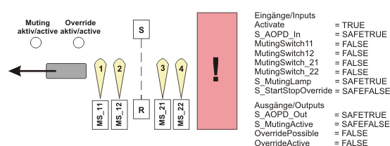 Only the material flow direction from muting sensors MutingSwitch11MutingSwitch12 to muting sensors MutingSwitch21MutingSwitch22 is described in the following. This is illustrated in the graphic in the function block overview.
