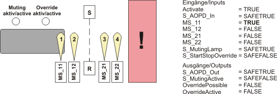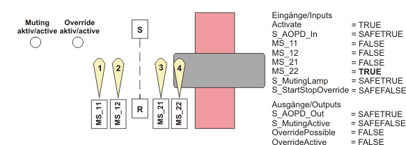 • The object is already behind the safety-related equipment, i.e., a SAFETRUE signal is present at the S_AOPD_In input again and the muting sensors 1 and 2 report FALSE again.