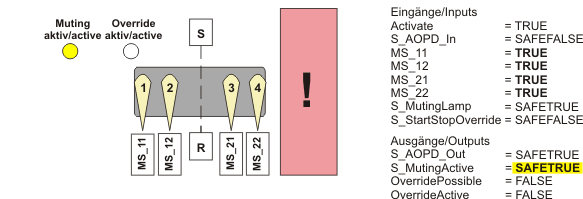 • An object interrupts the light beam of the safety-related equipment, i.e., S_AOPD_In switches to SAFEFALSE. S_AOPD_Out remains SAFETRUE because the muting operation is still active.