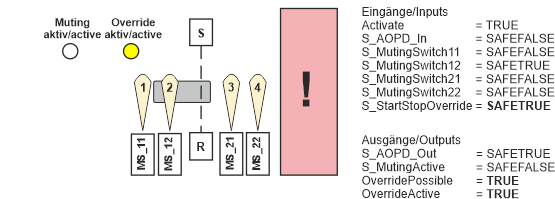 If the muting is interrupted by an error (e.g., the maximum muting time MaxMutingTime has elapsed because of an impermissible object), the safety-related equipment gets activated. This can be temporarily deactivated by the override function, e.g., to clear the zone of operation from the impermissible object.