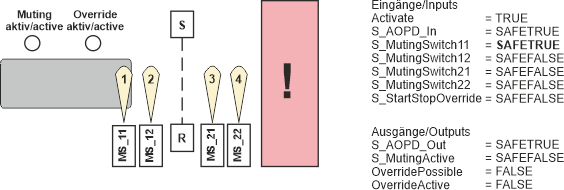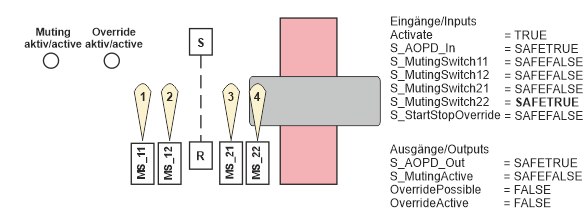 - For a material flow direction from left to right: first, S_MutingSwitch11 must become SAFETRUE and subsequently S_MutingSwitch12. Both inputs must remain SAFETRUE until S_MutingSwitch21 and then S_MutingSwitch22 also become SAFETRUE.