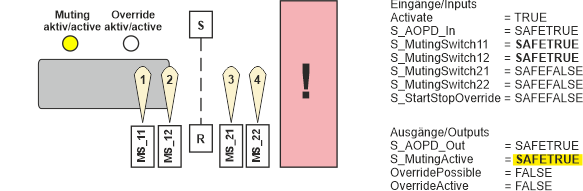 - S/R: Safety-related equipment (e.g., light grid), consisting of a transmitter (S) and a receiver (R), connected to function block input S_AOPD_In. The function of this safety-related equipment is deactivated/activated by means of the muting operation.