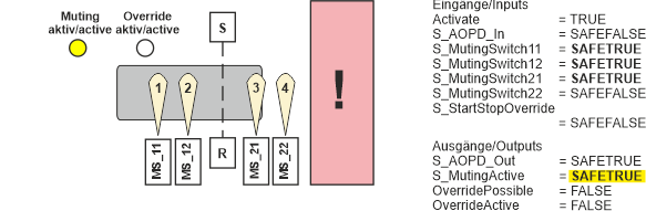 These two sensors are positioned behind the safety-related equipment in the material flow direction of the assembly conveyor. - Signaling unit (e.g., lamp) "muting active", controlled via function block output S_MutingActive.