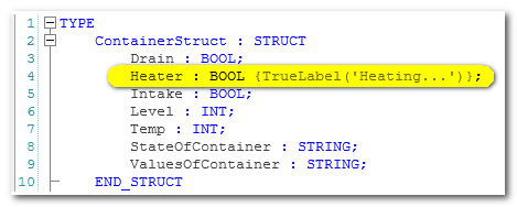 Example: In a user-defined STRUCT data type, a TrueLabel pragma is defined for a Boolean variable Heater.