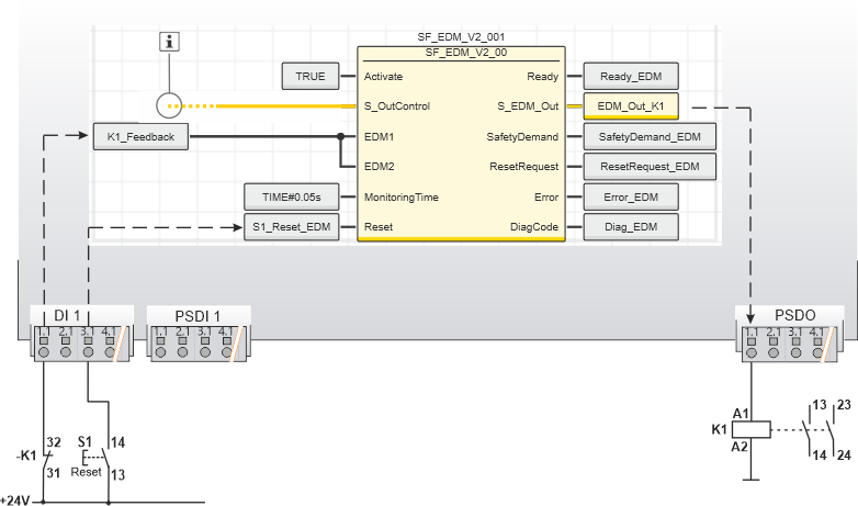 In this example, the safety-related SF_EDM function block monitors the switching behavior of a contactor K1 connected to output terminal 1.1 of the safety-related output device PSDO.