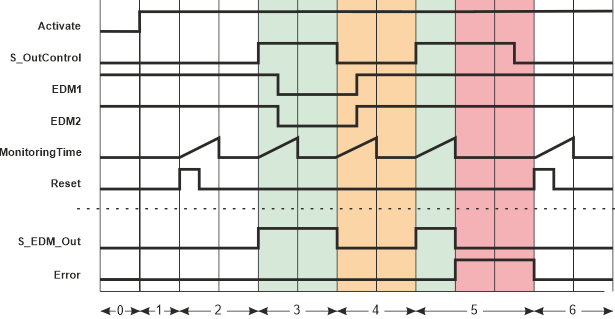 | 2 | When the FALSE > TRUE edge applies at the Reset input, the init state is left (start-up inhibit removed) and the time set at MonitoringTime for the two inputs EDM1 and EDM2 is started. The monitoring time expires without result, as inputs EDM1 and EDM2 are both TRUE. |