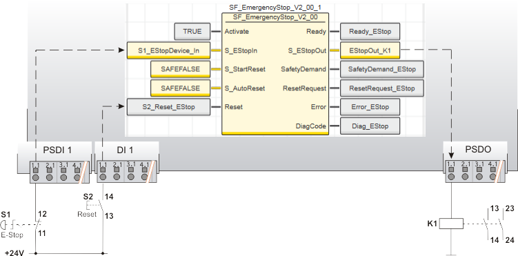 - The global I/O variable EStopOut_K1 is connected to output S_EStopOut of the function block. This global I/O variable has the 1.1 output terminal of the safety-related output device PSDO as address.