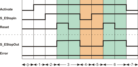 | 7 | The function block activation is reset (Activate = FALSE), S_EStopOut output = SAFEFALSE. |