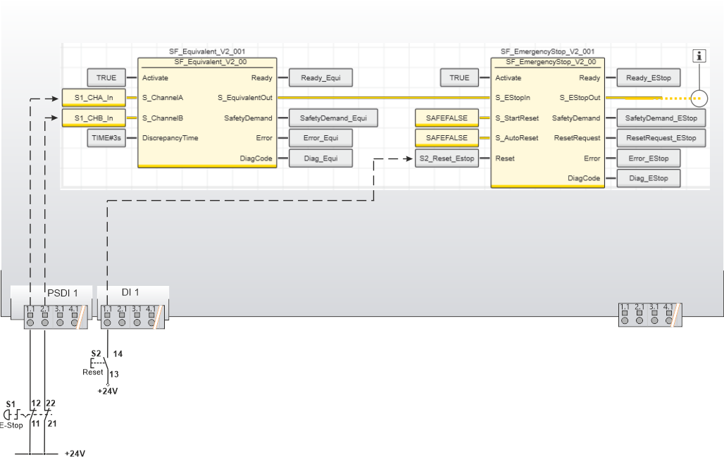 This example illustrates two-channel control of the safety-related SF_EmergencyStop function block with the help of the safety-related SF_Equivalent function block. The emergency-stop control device is connected to the inputs 1.1 and 2.1 of the safety-related input device PSDI with an ID of 1. The N/C contacts of the emergency-stop control device are connected to the safety-related SF_Equivalent function block for evaluation purposes. The S_EquivalentOut enable signal of the SF_Equivalent function block resulting from this is connected to the safety-related SF_EmergencyStop function block for further evaluation.