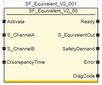 | The safety-related SF_Equivalent function block monitors the signals of two safety-related input terminals for the same signal states. Typically, these signals come from two-channel sensors or switches such as an emergency-stop control device.The enable signal S_EquivalentOut becomes SAFETRUE when the function block is activated, has not detected an error and the S_ChannelA and S_ChannelB inputs both show the SAFETRUE state within the time set at DiscrepancyTime.For this to happen, the function block must be activated (Activate = TRUE) and it must not have detected any errors (Error = FALSE).