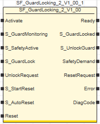 | The safety-related SF_GuardLocking 2 function block supports the monitoring of a guard with guard locking (door monitoring with a according to the DIN EN ISO 14119 standard).S_StartReset can be used to specify a start-up inhibit and S_AutoReset can be used to specify a restart inhibit.