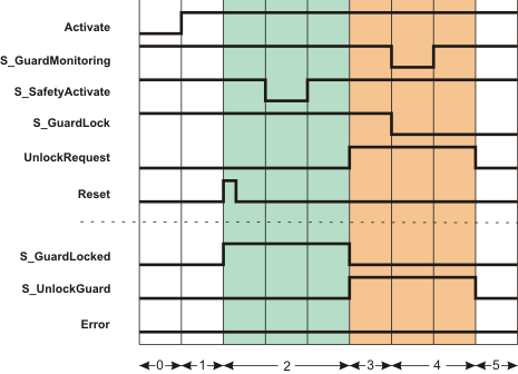 | 2 | A positive edge at the Reset input removes the start-up inhibit and the S_GuardLocked output switches to SAFETRUE.The S_GuardLocked output remains SAFETRUE, although the S_SafetyActive input is SAFEFALSE for some time (zone of operation is temporarily no longer in the defined safe state). |