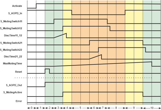 | 9 | The object has passed the light grid (S_AOPD_In switches back to SAFETRUE). S_MutingSwitch21 and S_MutingSwitch22 are still SAFETRUE, muting is still active (S_MutingActive remains SAFETRUE). |
