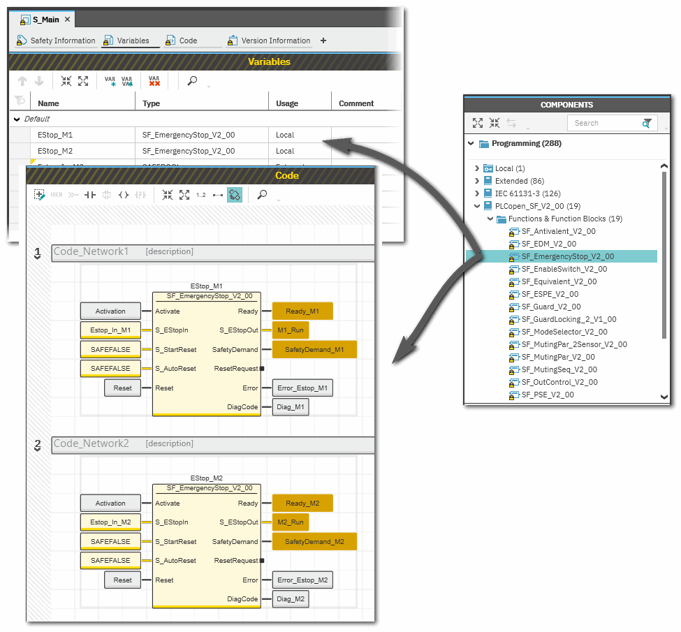 The safety-related PLCopen function block 'SF_EmergencyStop_V2_00' was inserted into the project via a library. It is then available in the 'Programming' category of the COMPONENTS area. There is a folder with the same name as the library that provides the FBs for insertion into the safety-related code. The FB is to be called twice in the code of the safety-related program 'S_Main' to evaluate the status of two safety-related emergency stop command devices. For each FB instance, an instance name is declared in the 'Variables' table of the calling program: EStop_M1 and EStop_M2. The FB instances have been inserted into the code worksheet, each instance with different variables connected to its input and output formal parameters.