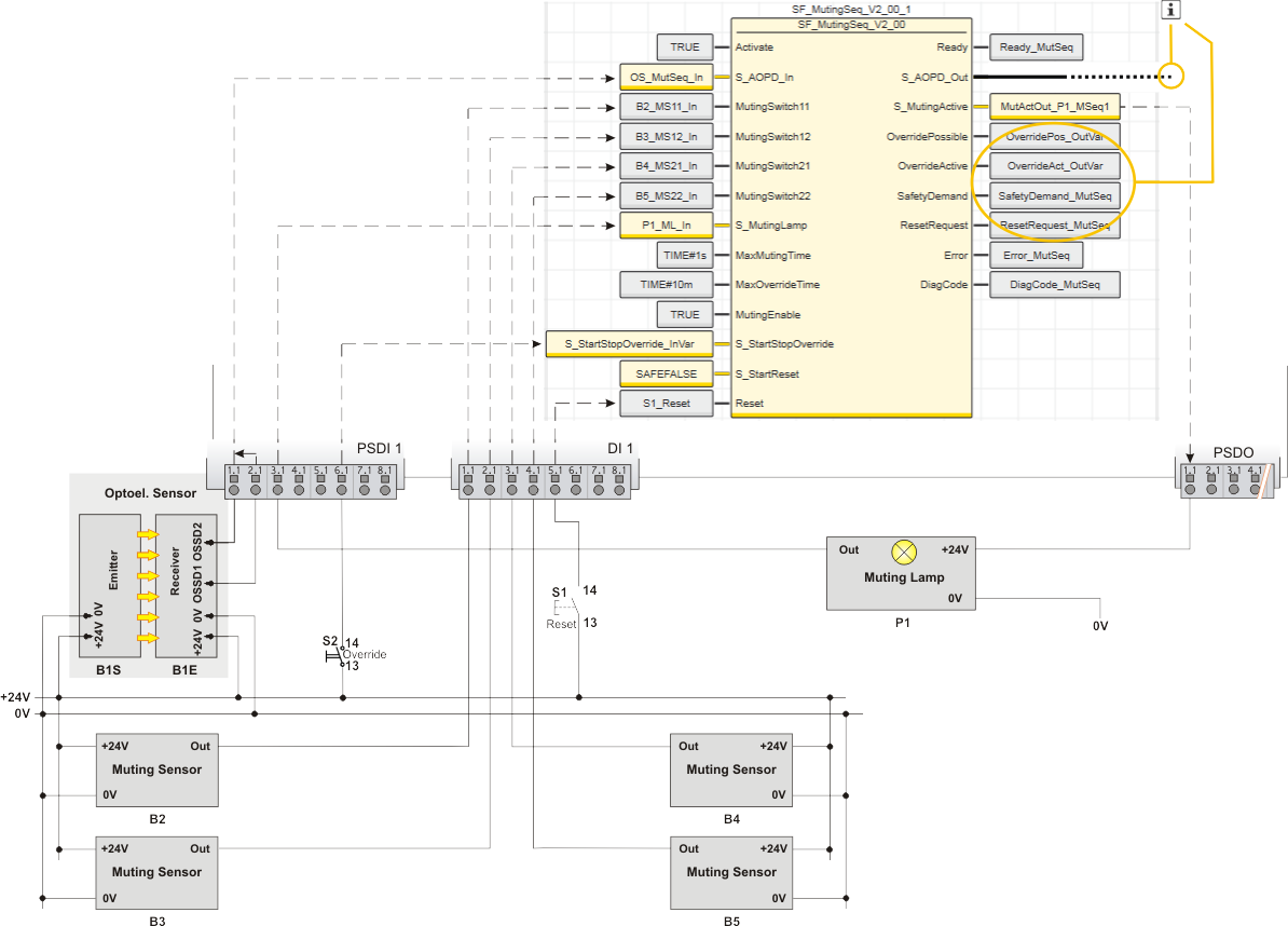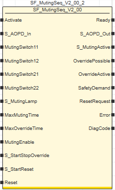 The S_AOPD_Out enable output of the SF_MutingSeq function block is connected to an output terminal of the application via a global I/O variable or via other safety-related functions/function blocks. The function block outputs OverridePossible, OverrideActive, SafetyDemand, and ResetRequest may be connected to device outputs for signaling purposes. |