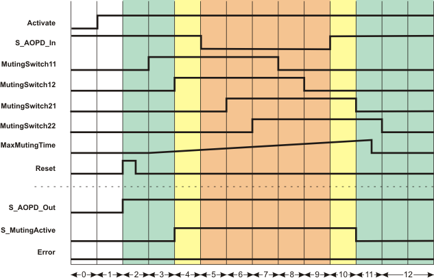- The muting operation is complete when the first muting sensor behind the safety-related equipment (at the MutingSwitch12 input) provides FALSE again.