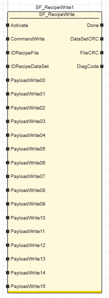 Short Description The SF_RecipeWrite FB can be used to create or modify a recipe file with the values applied to its PayloadWrite inputs. After writing them into the specified data set (section) of the recipe file, the entire file and the written data set are sealed and checksums are generated.