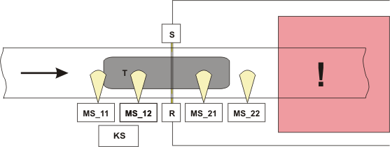 Only the material flow direction from muting sensors MutingSwitch11MutingSwitch12 to muting sensors MutingSwitch21MutingSwitch22 is described in the following. This means the sequential muting sensor pair MutingSwitch11/MutingSwitch12 is positioned before the safety-related equipment and MutingSwitch21/MutingSwitch22 is behind the safety-related equipment. This is illustrated in the graphic in the function block overview.