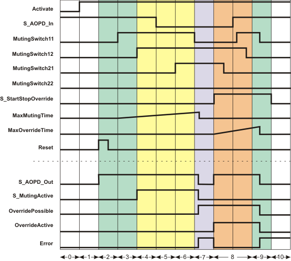 9The override operation is exited automatically, as the object has been removed (all muting sensors are FALSE) and the light grid detects no object anymore (input S_AOPD_In = SAFETRUE).