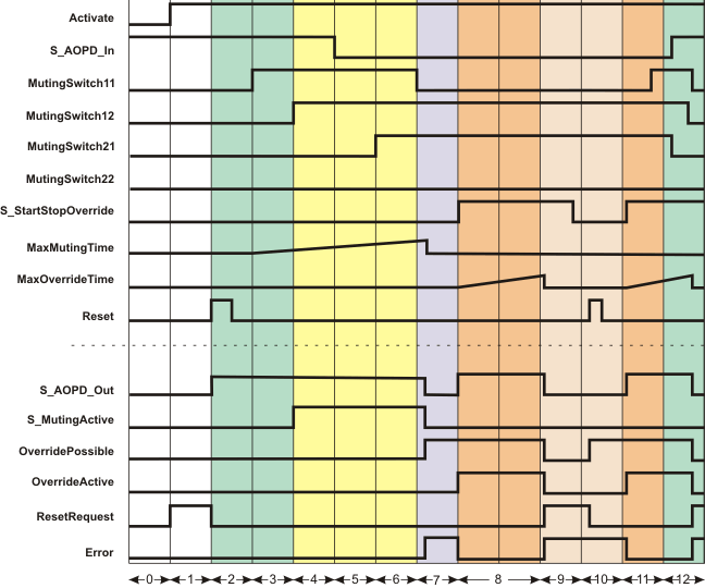 As a result, the Error output becomes TRUE, and the output S_AOPD_Out switches to SAFETRUE. The outputs OverridePossible and OverrideActive switch to FALSE. A reset is required because of the override error and this is signaled at the ResetRequest output (ResetRequest = TRUE).