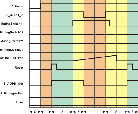 When S_AOPD_In switches to SAFEFALSE, the muting operation is canceled. As a result, the enable output S_AOPD_Out is switched to SAFEFALSE.