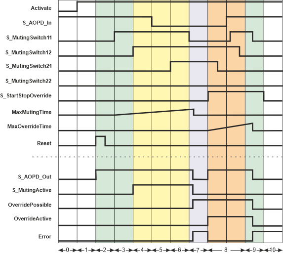 | 9 | The override operation is exited automatically, as the object has been removed (all muting sensors are SAFEFALSE) and the light grid detects no object anymore (input S_AOPD_In = SAFETRUE).After the successful override operation the Error output switches to TRUE again because the previous muting error must first be confirmed by a reset request. The S_AOPD_Out output thus switches to SAFEFALSE. |