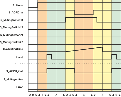 | 7 | The S_MutingSwitch11 muting sensor detects no object anymore and switches to SAFEFALSE before the S_MutingSwitch22 muting sensor switches to SAFETRUE (the light grid is still interrupted, i.e., S_AOPD_In = SAFEFALSE).This means a muting error occurs and the Error output switches to TRUE.Muting is immediately deactivated (the S_MutingActive output switches to SAFEFALSE and the MaxMutingTime timer is stopped) and the machine must not continue to run in the zone of operation. The S_AOPD_Out output switches to SAFEFALSE.The requirements for an override operation are given. The OverridePossible output switches to TRUE. |
