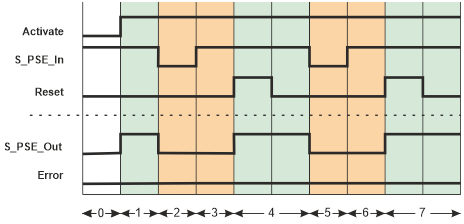 7Positive signal edge at the Reset input resets the restart inhibit, followed by normal operation. The S_PSE_Out output becomes SAFETRUE.