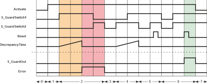 | 3 | The door is opened again. This switches both inputs S_GuardSwitch1 and S_GuardSwitch2 to SAFEFALSE. This state causes the error message to be removed: The Error output becomes FALSE. |