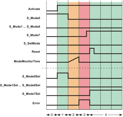 3As the S_Mode7 input does not become SAFETRUE within the time set at ModeMonitorTime, an error message is output once ModeMonitorTime has elapsed: The Error output becomes TRUE. Outputs S_Mode0Sel to S_Mode7Sel all remain in the defined safe state (SAFEFALSE).