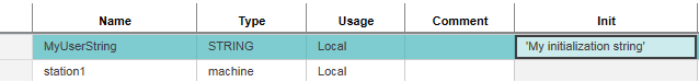 An initial value is set for a string in the variables table by entering the initialization string into the 'Init' column enclosed in single quotation marks.