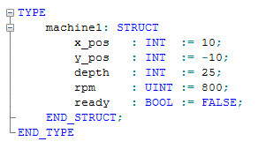 In the following example, the structured data type 'machine' consists of the components x_pos, y_pos, depth and rpm. All components describe the characteristics of the machine.
