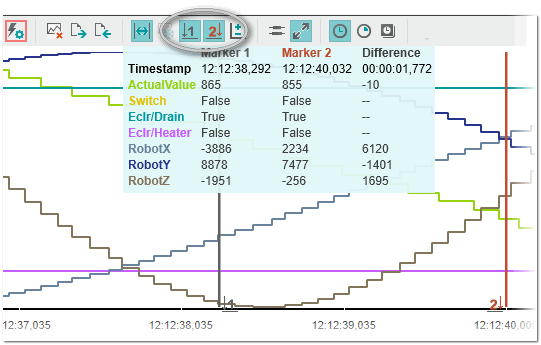 As soon as values have been recorded, you can display a popup that shows the exact variable values at the current point in time (first marker).