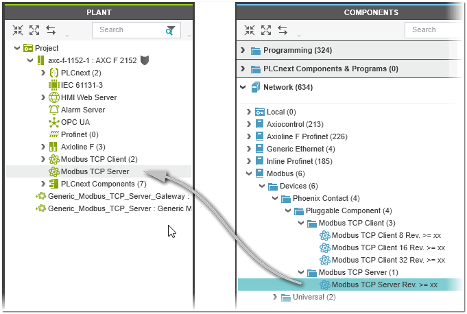 The Modbus/TCP local server appears under the Modbus TCP Server node in the PLANT after you have added the Modbus TCP server device via drag & drop from the COMPONENTS area.