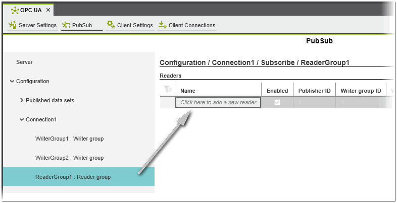 In addition to manually adding a new reader group as described in the following procedure, you can also import a reader group with the contained readers from an external PubSub configuration of a remote OPC UA server. See the topic "Importing External Configurations from Remote Servers" for details. |